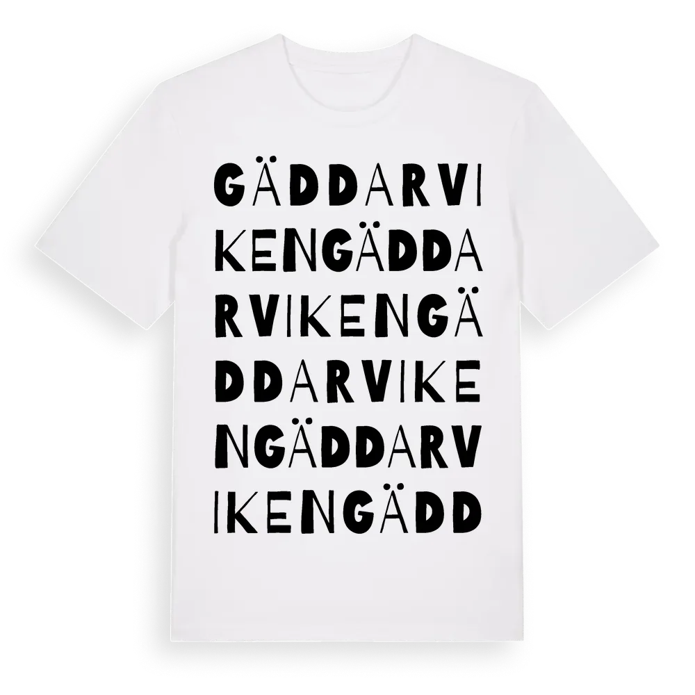 Gäddarviken ordlek t-shirt är inspirerad av Gäddarviken i Uppsala län, Sverige. Tröjan är designad för dig som har en speciell koppling till platsen – oavsett om du bor här, har rötterna här eller bara älskar Gäddarviken.