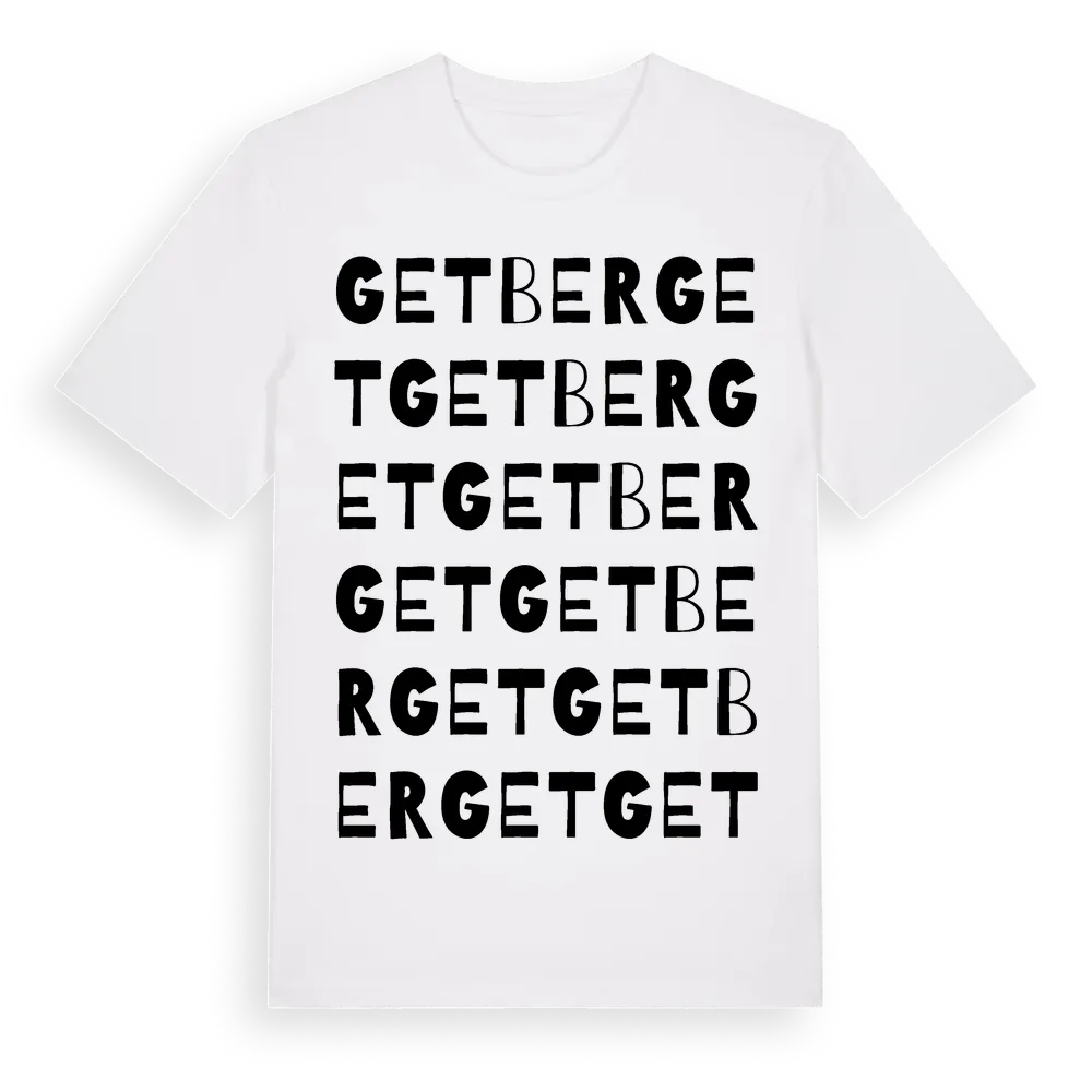 Getberget ordlek t-shirt är inspirerad av byn Getberget i Uppsala län, Sverige. Tröjan är designad för dig som har en speciell koppling till platsen – oavsett om du bor här, har rötterna här eller bara älskar Getberget.