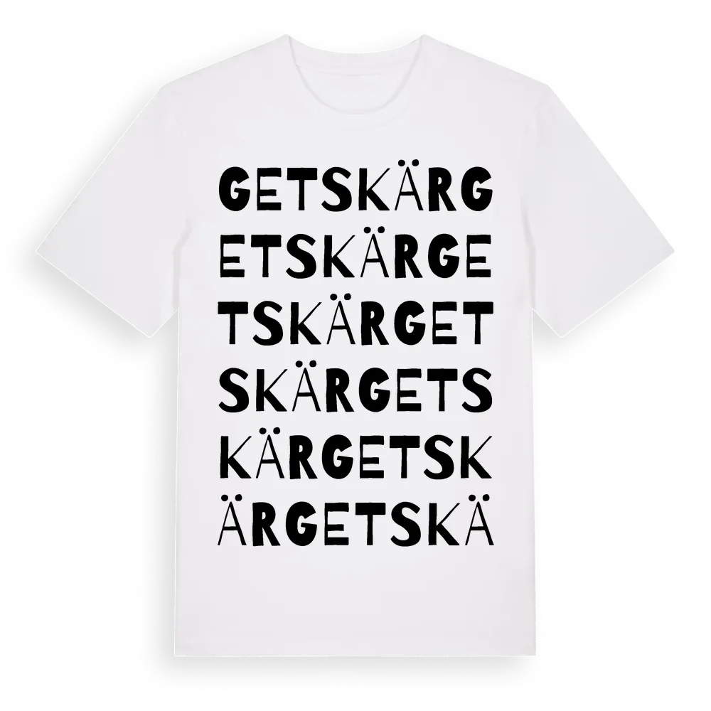 Getskär ordlek t-shirt är inspirerad av Getskär i Uppsala län, Sverige. Tröjan är designad för dig som har en speciell koppling till platsen – oavsett om du bor här, har rötterna här eller bara älskar Getskär.