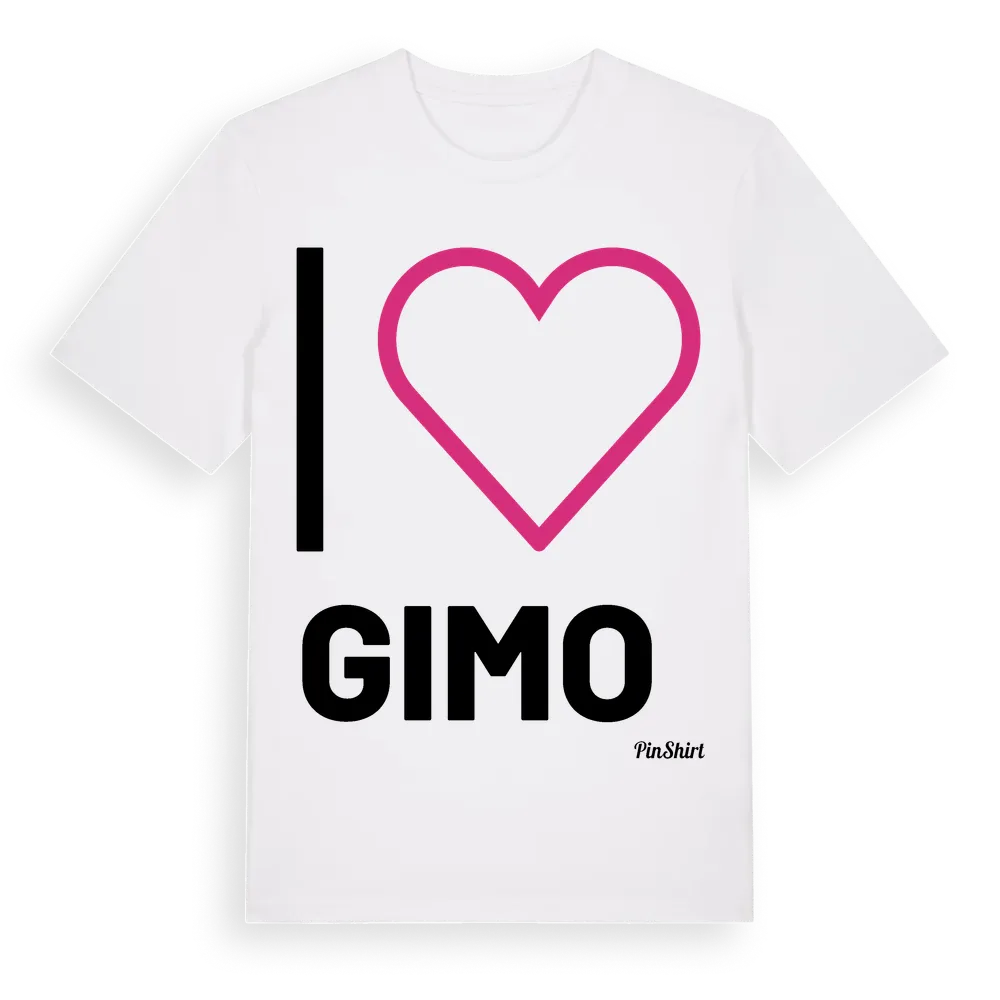 Det klassiska "I ❤ Gimo"-motivet i stort format som täcker hela bröstet. För dig som vill visa kärleken till Gimo på riktigt. Premium bomull, unisex – från byn Gimo i Uppsala län.