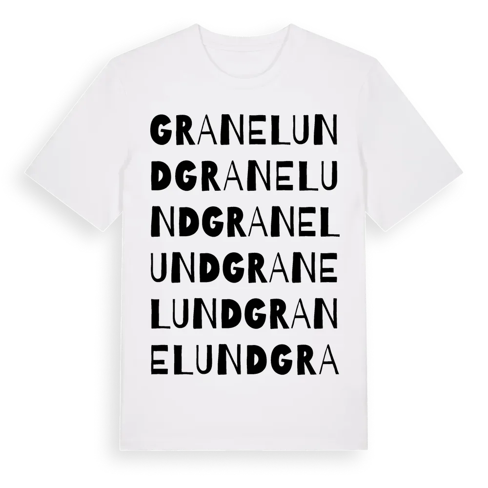 Granelund ordlek t-shirt är inspirerad av Granelund i Uppsala län, Sverige. Tröjan är designad för dig som har en speciell koppling till platsen – oavsett om du bor här, har rötterna här eller bara älskar Granelund.