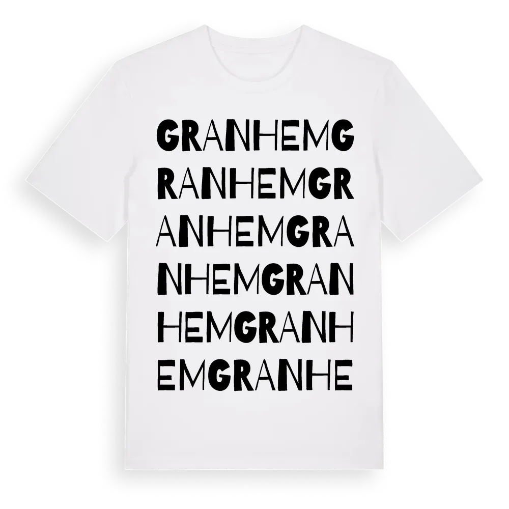 Granhem ordlek t-shirt är inspirerad av Granhem i Uppsala län, Sverige. Tröjan är designad för dig som har en speciell koppling till platsen – oavsett om du bor här, har rötterna här eller bara älskar Granhem.
