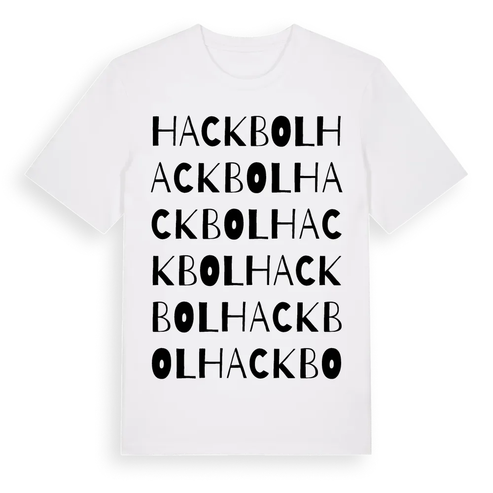En ordlek byggd på Hackbols namn. Subtilt och klurig – ett motiv som bara de som verkligen känner platsen fullt ut förstår. Premium bomull, unisex – från Hackbol i Uppsala län.