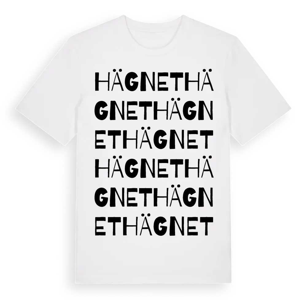 Hägnet ordlek t-shirt är inspirerad av Hägnet i Uppsala län, Sverige. Tröjan är designad för dig som har en speciell koppling till platsen – oavsett om du bor här, har rötterna här eller bara älskar Hägnet.