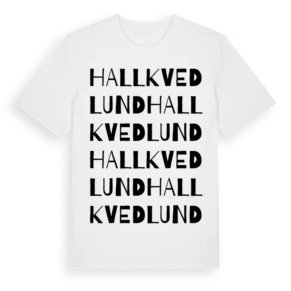 Hallkvedlund ordlek t-shirt är inspirerad av Hallkvedlund i Uppsala län, Sverige. Tröjan är designad för dig som har en speciell koppling till platsen – oavsett om du bor här, har rötterna här eller bara älskar Hallkvedlund.