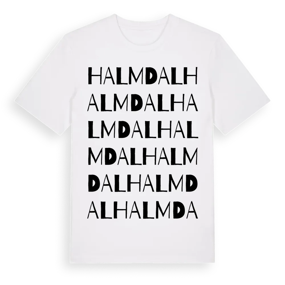 Halmdal ordlek t-shirt är inspirerad av Halmdal i Uppsala län, Sverige. Tröjan är designad för dig som har en speciell koppling till platsen – oavsett om du bor här, har rötterna här eller bara älskar Halmdal.
