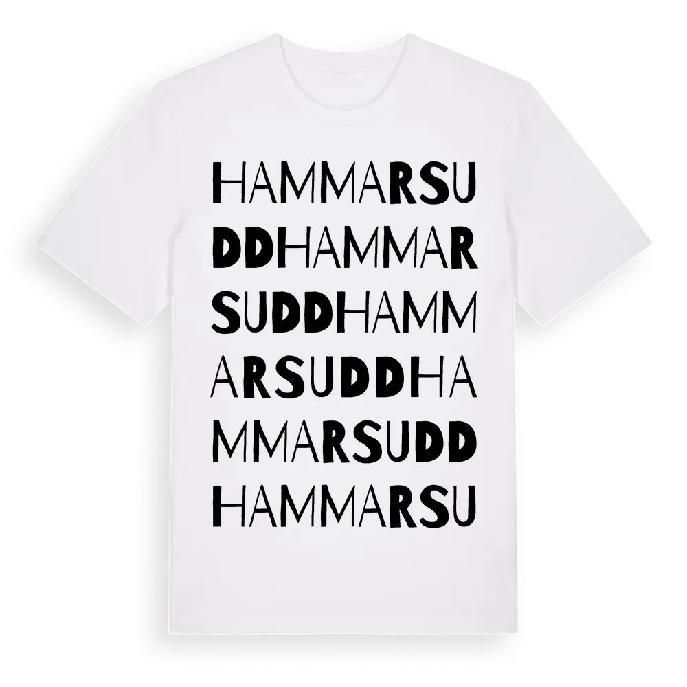 Hammarsudd ordlek t-shirt är inspirerad av byn Hammarsudd i Uppsala län, Sverige. Tröjan är designad för dig som har en speciell koppling till platsen – oavsett om du bor här, har rötterna här eller bara älskar Hammarsudd.