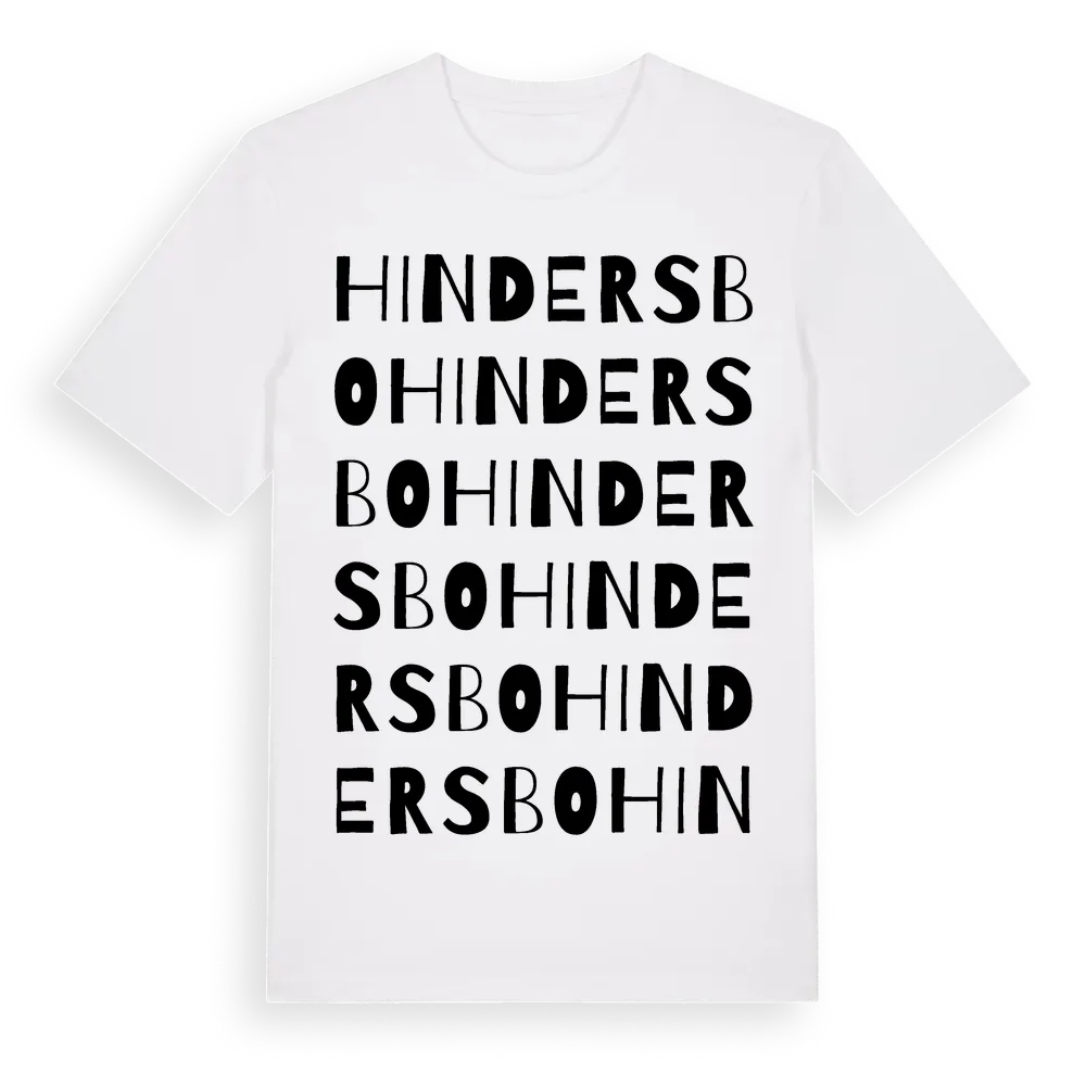 Hindersbo ordlek t-shirt är inspirerad av byn Hindersbo i Uppsala län, Sverige. Tröjan är designad för dig som har en speciell koppling till platsen – oavsett om du bor här, har rötterna här eller bara älskar Hindersbo.