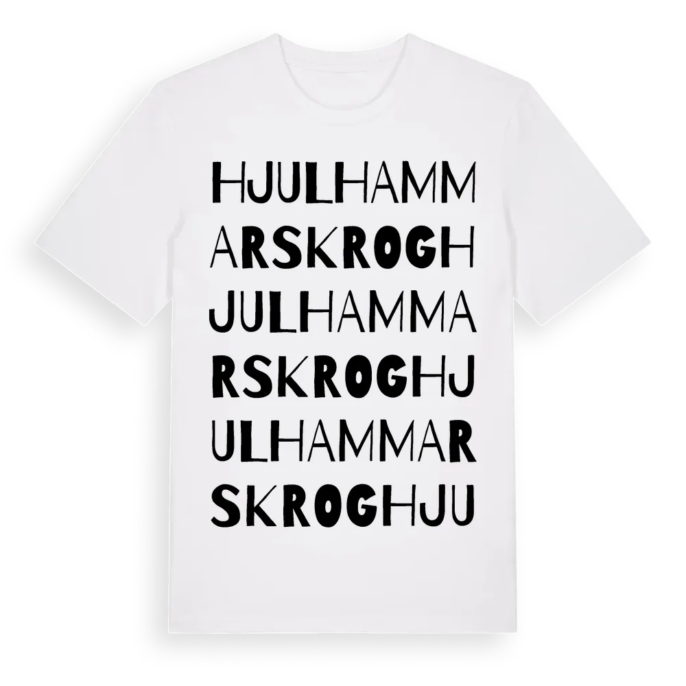 Hjulhammarskrog ordlek t-shirt är inspirerad av Hjulhammarskrog i Uppsala län, Sverige. Tröjan är designad för dig som har en speciell koppling till platsen – oavsett om du bor här, har rötterna här eller bara älskar Hjulhammarskrog.