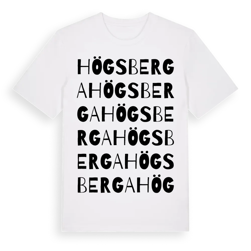 Högsberga ordlek t-shirt är inspirerad av Högsberga i Uppsala län, Sverige. Tröjan är designad för dig som har en speciell koppling till platsen – oavsett om du bor här, har rötterna här eller bara älskar Högsberga.