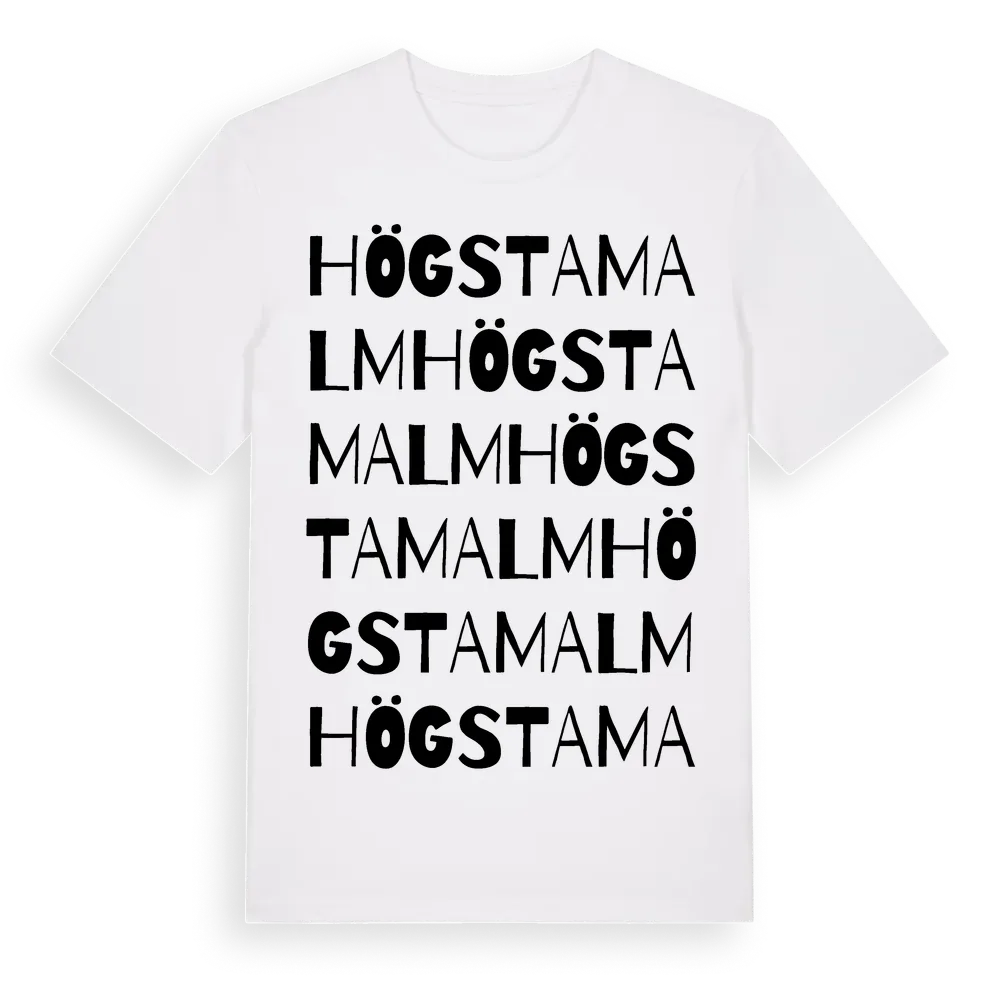 Högsta Malm ordlek t-shirt är inspirerad av Högsta Malm i Uppsala län, Sverige. Tröjan är designad för dig som har en speciell koppling till platsen – oavsett om du bor här, har rötterna här eller bara älskar Högsta Malm.