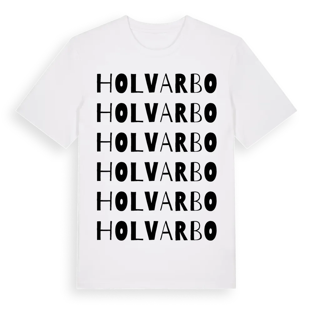 Holvarbo ordlek t-shirt är inspirerad av byn Holvarbo i Uppsala län, Sverige. Tröjan är designad för dig som har en speciell koppling till platsen – oavsett om du bor här, har rötterna här eller bara älskar Holvarbo.