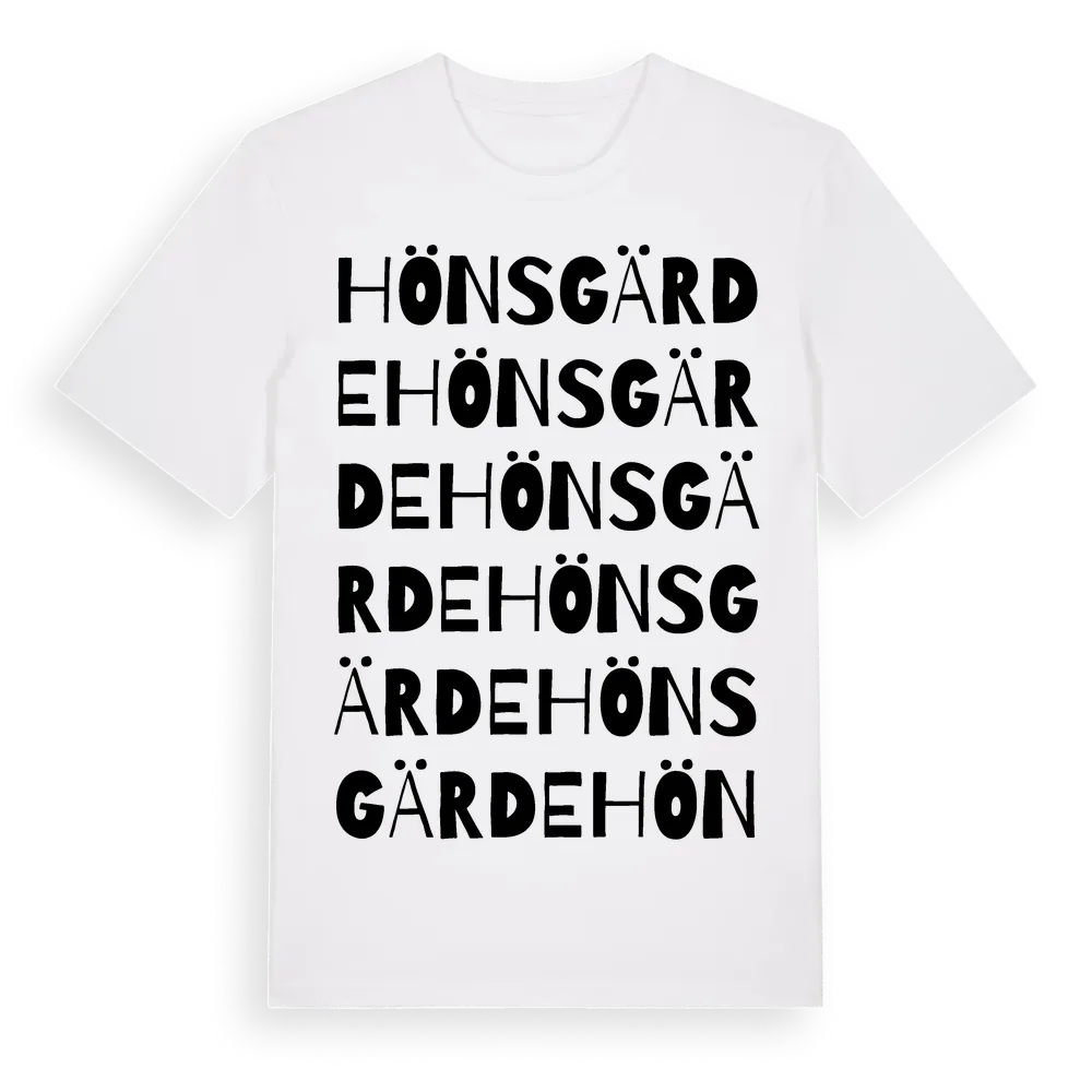 Hönsgärde ordlek t-shirt är inspirerad av Hönsgärde i Uppsala län, Sverige. Tröjan är designad för dig som har en speciell koppling till platsen – oavsett om du bor här, har rötterna här eller bara älskar Hönsgärde.