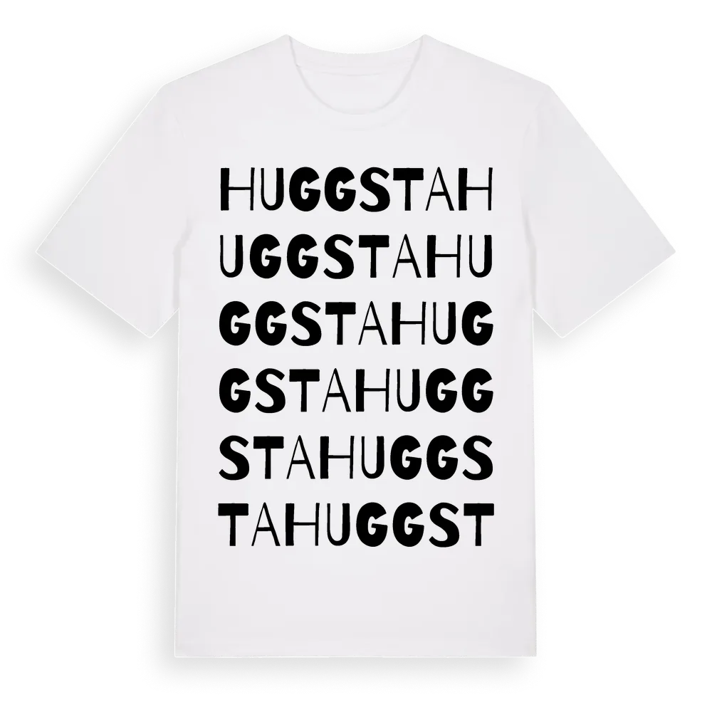 En ordlek byggd på Huggstas namn. Subtilt och klurig – ett motiv som bara de som verkligen känner platsen fullt ut förstår. Premium bomull, unisex – från Huggsta i Uppsala län.