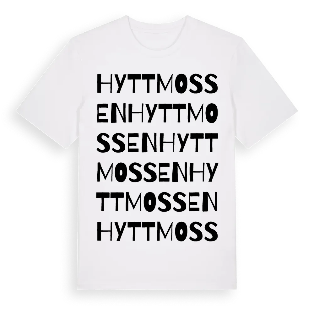 Hyttmossen ordlek t-shirt är inspirerad av Hyttmossen i Uppsala län, Sverige. Tröjan är designad för dig som har en speciell koppling till platsen – oavsett om du bor här, har rötterna här eller bara älskar Hyttmossen.