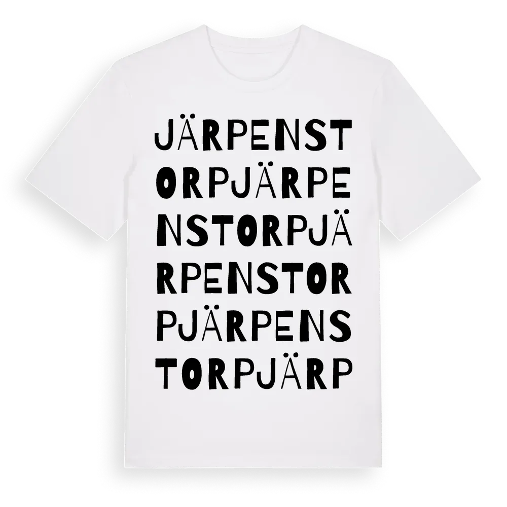 Järpenstorp ordlek t-shirt är inspirerad av Järpenstorp i Uppsala län, Sverige. Tröjan är designad för dig som har en speciell koppling till platsen – oavsett om du bor här, har rötterna här eller bara älskar Järpenstorp.