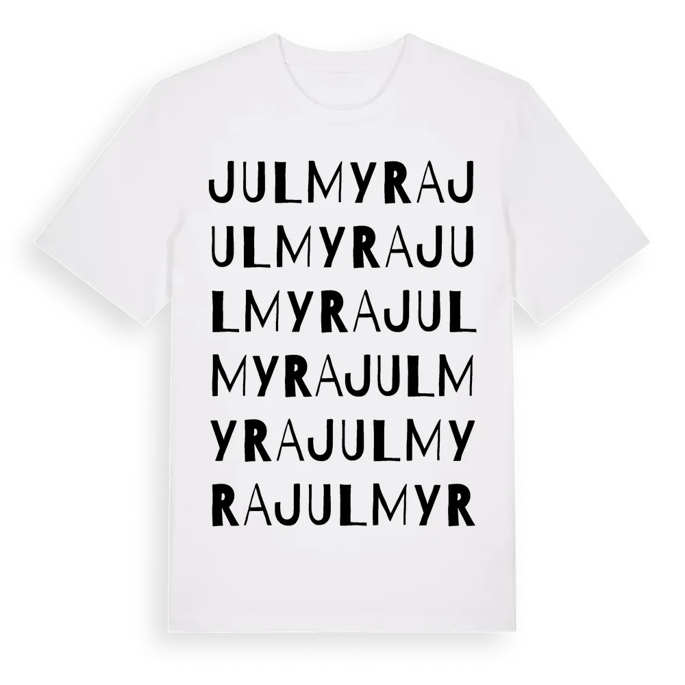 Julmyra ordlek t-shirt är inspirerad av byn Julmyra i Uppsala län, Sverige. Tröjan är designad för dig som har en speciell koppling till platsen – oavsett om du bor här, har rötterna här eller bara älskar Julmyra.