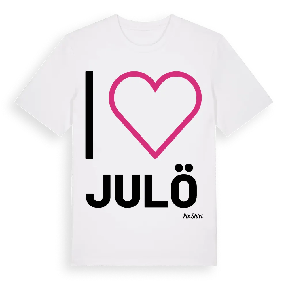Det klassiska "I ❤ Julö"-motivet i stort format som täcker hela bröstet. För dig som vill visa kärleken till Julö på riktigt. Premium bomull, unisex – från byn Julö i Uppsala län.