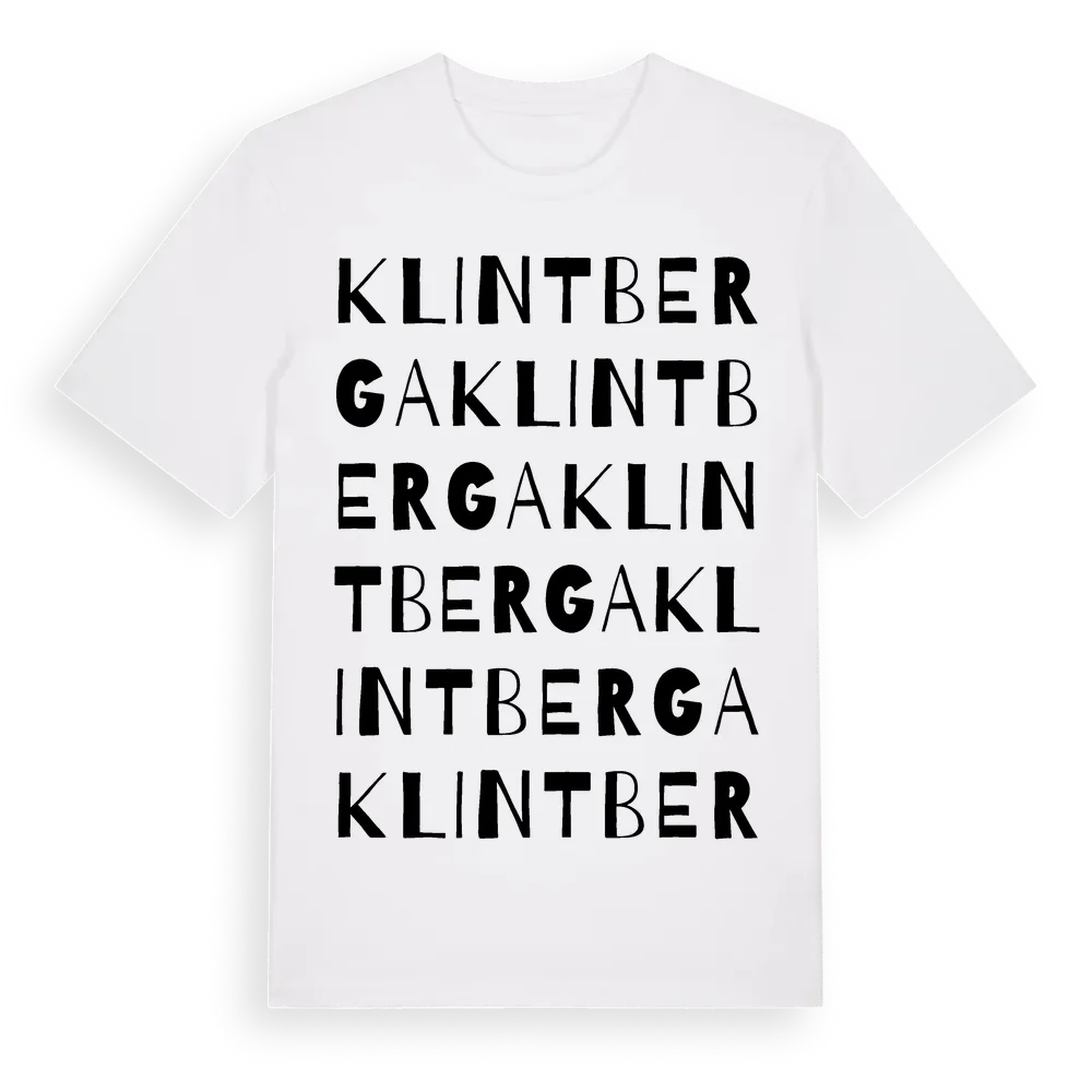 Klintberga ordlek t-shirt är inspirerad av Klintberga i Uppsala län, Sverige. Tröjan är designad för dig som har en speciell koppling till platsen – oavsett om du bor här, har rötterna här eller bara älskar Klintberga.