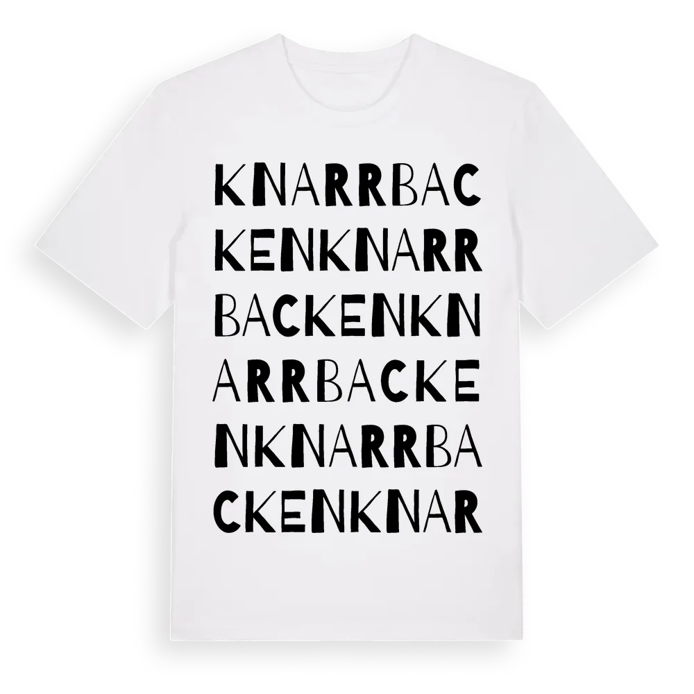 En ordlek byggd på Knarrbackens namn. Subtilt och klurig – ett motiv som bara de som verkligen känner platsen fullt ut förstår. Premium bomull, unisex – från stadsdelen Knarrbacken i Uppsala län.
