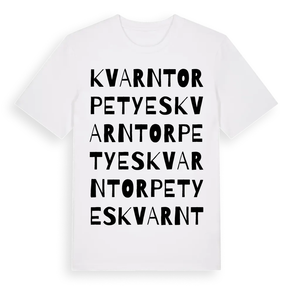 Kvarntorpetyes ordlek t-shirt är inspirerad av Kvarntorpetyes i Uppsala län, Sverige. Tröjan är designad för dig som har en speciell koppling till platsen – oavsett om du bor här, har rötterna här eller bara älskar Kvarntorpetyes.