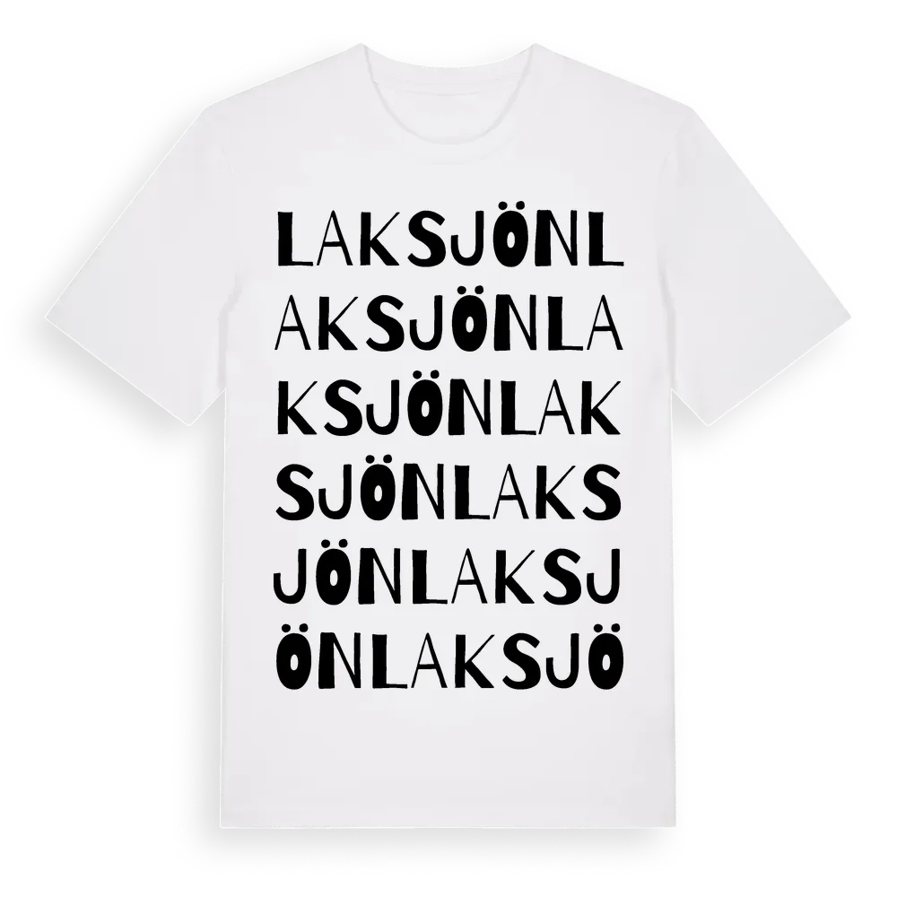 Laksjön ordlek t-shirt är inspirerad av byn Laksjön i Uppsala län, Sverige. Tröjan är designad för dig som har en speciell koppling till platsen – oavsett om du bor här, har rötterna här eller bara älskar Laksjön.