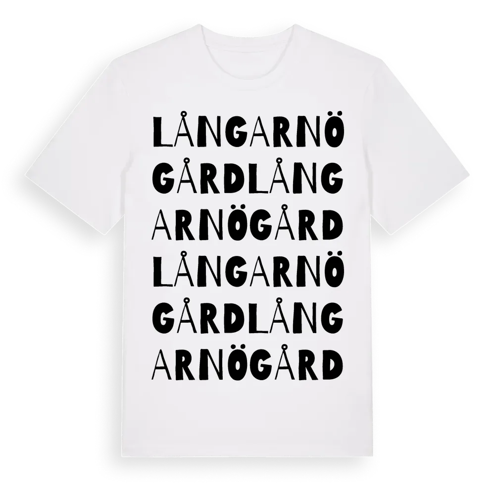 Långarnö Gård ordlek t-shirt är inspirerad av byn Långarnö Gård i Uppsala län, Sverige. Tröjan är designad för dig som har en speciell koppling till platsen – oavsett om du bor här, har rötterna här eller bara älskar Långarnö Gård.