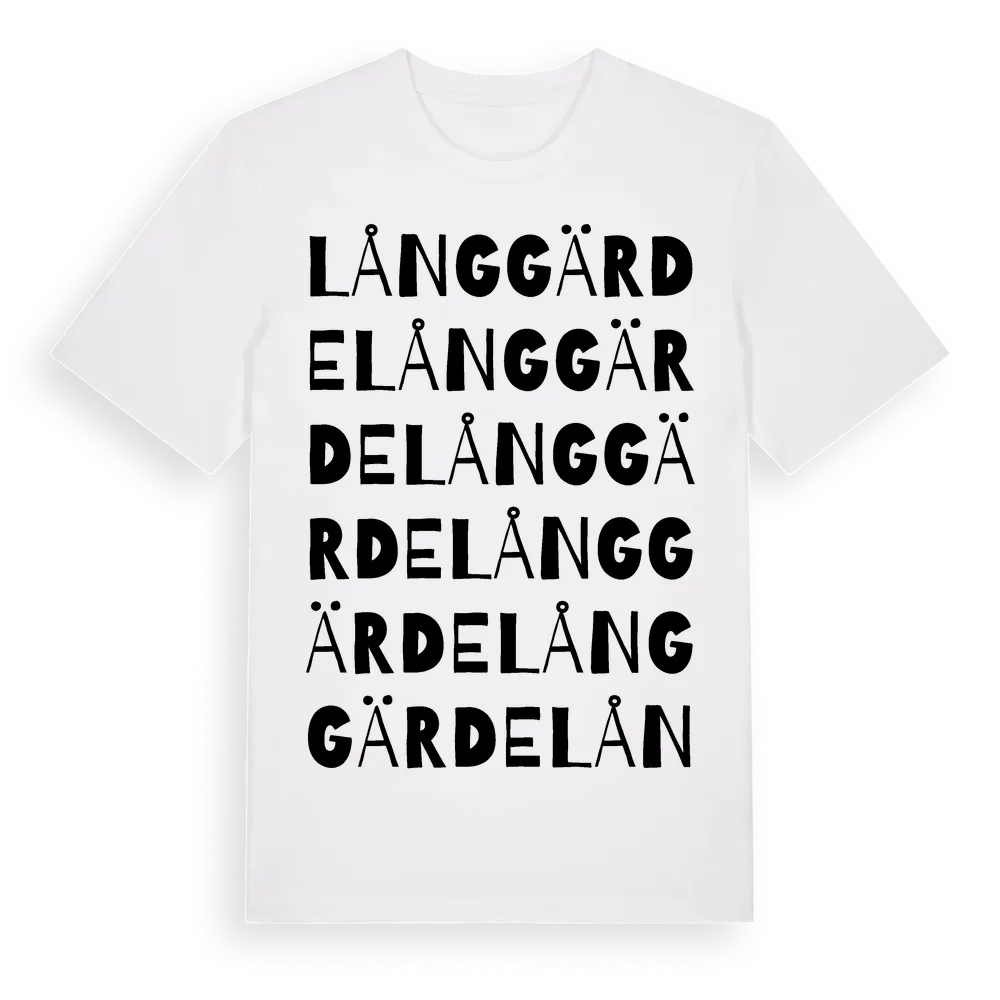 Långgärde ordlek t-shirt är inspirerad av Långgärde i Uppsala län, Sverige. Tröjan är designad för dig som har en speciell koppling till platsen – oavsett om du bor här, har rötterna här eller bara älskar Långgärde.