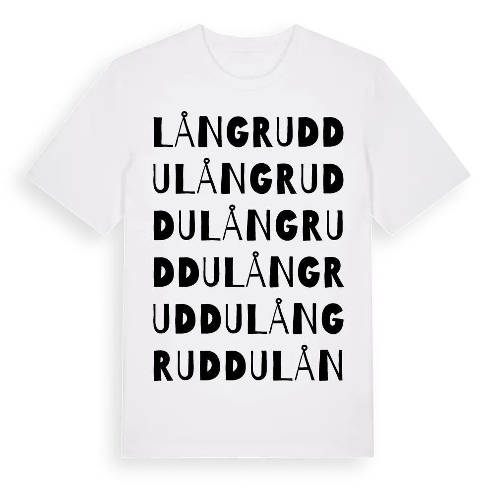 Långruddu ordlek t-shirt är inspirerad av Långruddu i Uppsala län, Sverige. Tröjan är designad för dig som har en speciell koppling till platsen – oavsett om du bor här, har rötterna här eller bara älskar Långruddu.