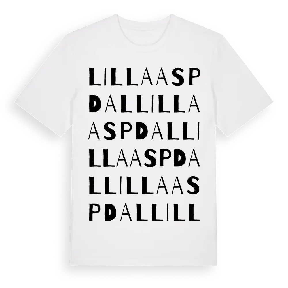 Lilla Aspdal ordlek t-shirt är inspirerad av Lilla Aspdal i Uppsala län, Sverige. Tröjan är designad för dig som har en speciell koppling till platsen – oavsett om du bor här, har rötterna här eller bara älskar Lilla Aspdal.