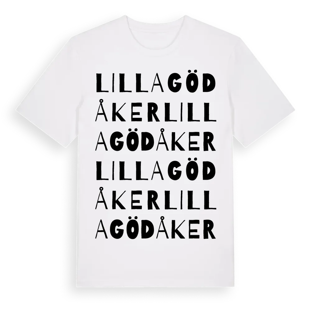 Lilla Gödåker ordlek t-shirt är inspirerad av Lilla Gödåker i Uppsala län, Sverige. Tröjan är designad för dig som har en speciell koppling till platsen – oavsett om du bor här, har rötterna här eller bara älskar Lilla Gödåker.