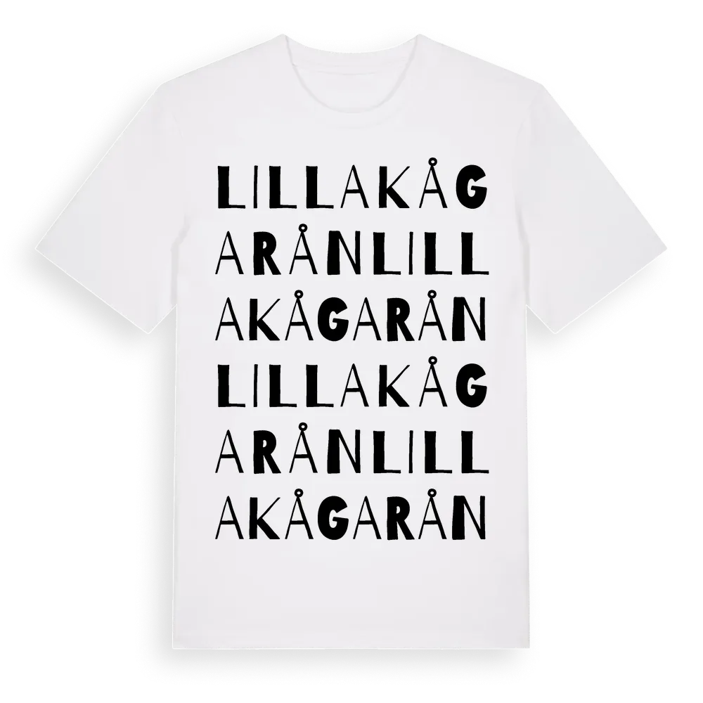 Lilla Kågarån ordlek t-shirt är inspirerad av Lilla Kågarån i Uppsala län, Sverige. Tröjan är designad för dig som har en speciell koppling till platsen – oavsett om du bor här, har rötterna här eller bara älskar Lilla Kågarån.