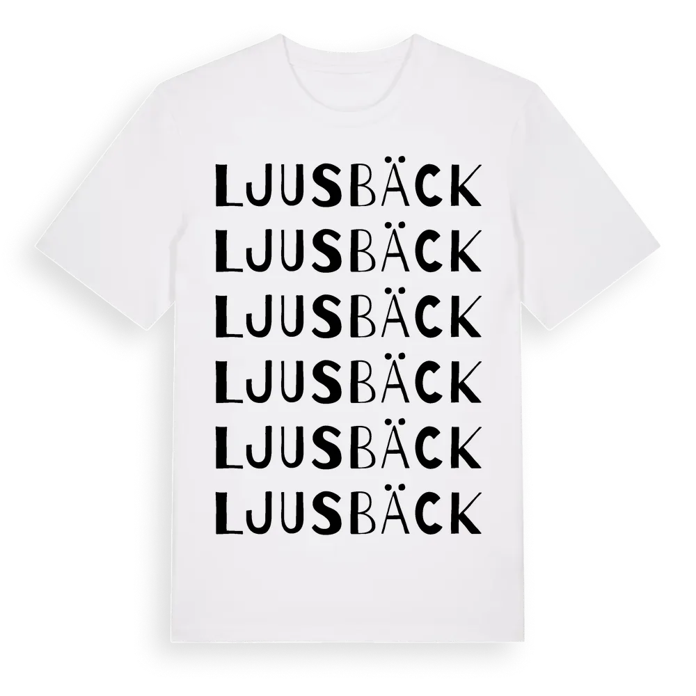 Ljusbäck ordlek t-shirt är inspirerad av byn Ljusbäck i Uppsala län, Sverige. Tröjan är designad för dig som har en speciell koppling till platsen – oavsett om du bor här, har rötterna här eller bara älskar Ljusbäck.