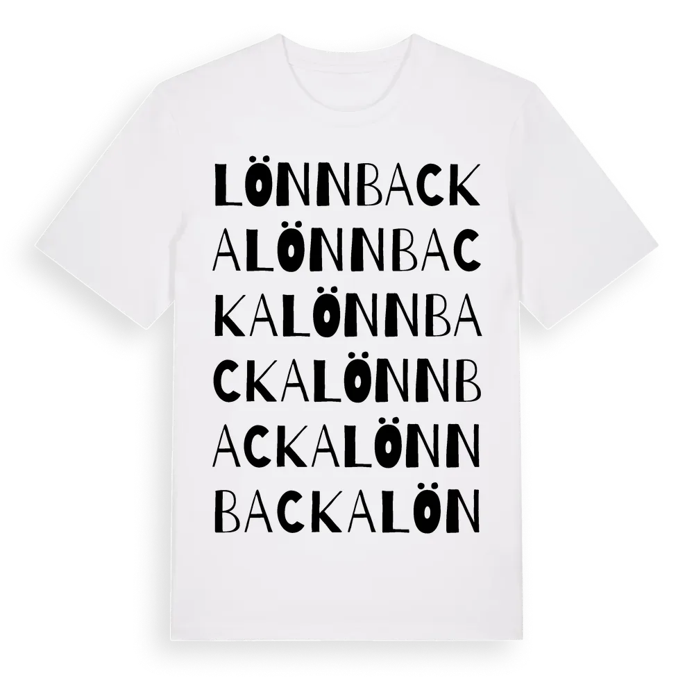 Lönnbacka ordlek t-shirt är inspirerad av Lönnbacka i Uppsala län, Sverige. Tröjan är designad för dig som har en speciell koppling till platsen – oavsett om du bor här, har rötterna här eller bara älskar Lönnbacka.