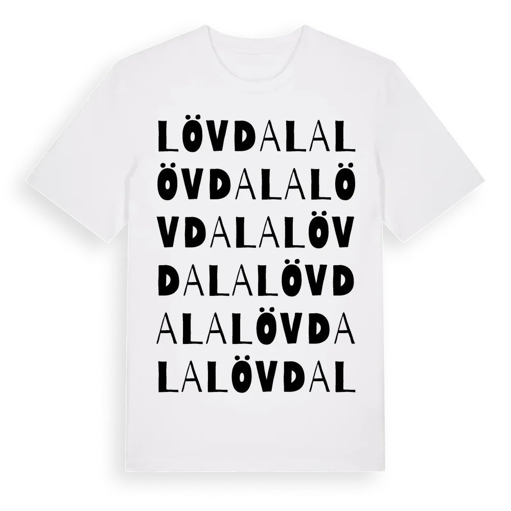 Lövdala ordlek t-shirt är inspirerad av Lövdala i Uppsala län, Sverige. Tröjan är designad för dig som har en speciell koppling till platsen – oavsett om du bor här, har rötterna här eller bara älskar Lövdala.