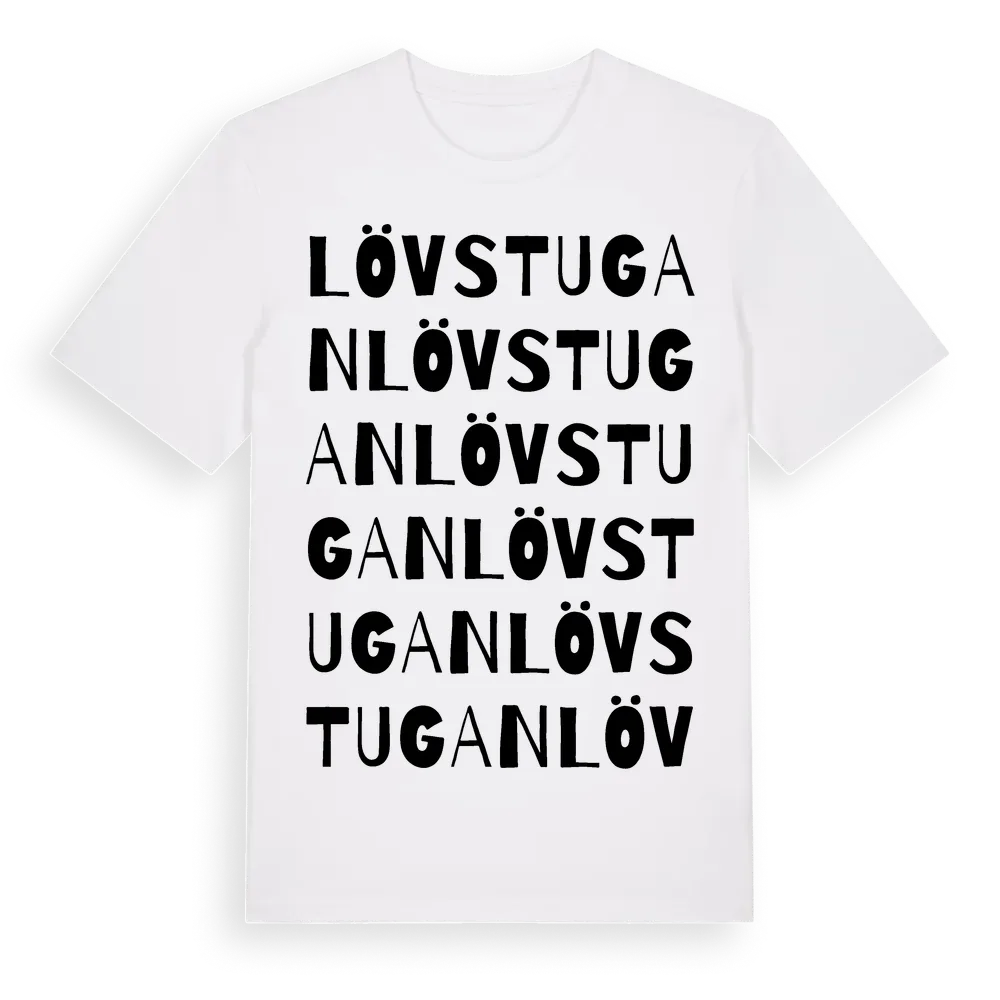 Lövstugan ordlek t-shirt är inspirerad av Lövstugan i Uppsala län, Sverige. Tröjan är designad för dig som har en speciell koppling till platsen – oavsett om du bor här, har rötterna här eller bara älskar Lövstugan.