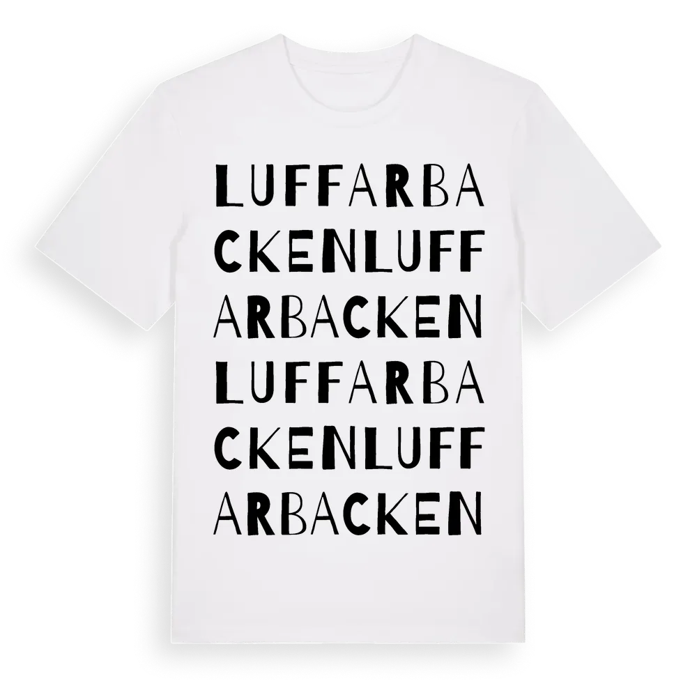 En ordlek byggd på Luffarbackens namn. Subtilt och klurig – ett motiv som bara de som verkligen känner platsen fullt ut förstår. Premium bomull, unisex – från Luffarbacken i Uppsala län.