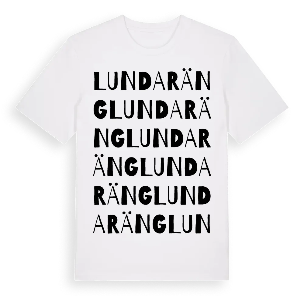 Lundaräng ordlek t-shirt är inspirerad av Lundaräng i Uppsala län, Sverige. Tröjan är designad för dig som har en speciell koppling till platsen – oavsett om du bor här, har rötterna här eller bara älskar Lundaräng.