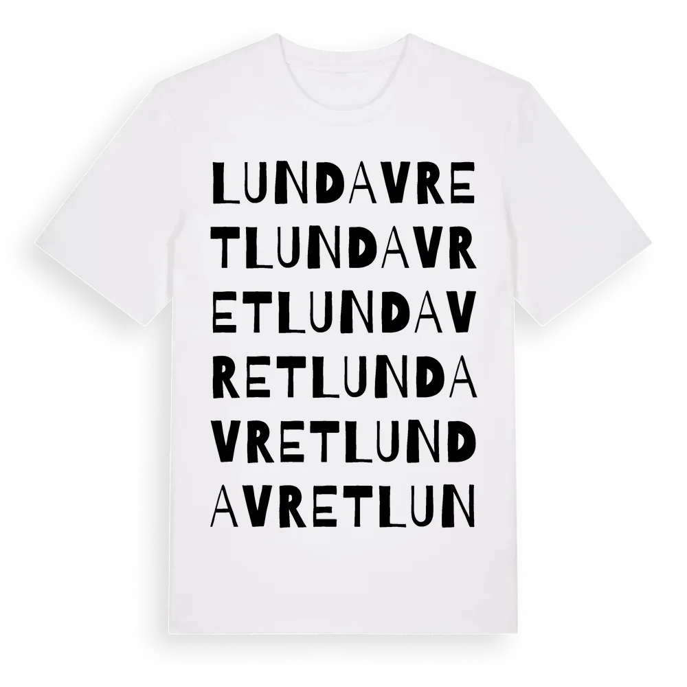 Lundavret ordlek t-shirt är inspirerad av stadsdelen Lundavret i Uppsala län, Sverige. Tröjan är designad för dig som har en speciell koppling till platsen – oavsett om du bor här, har rötterna här eller bara älskar Lundavret.