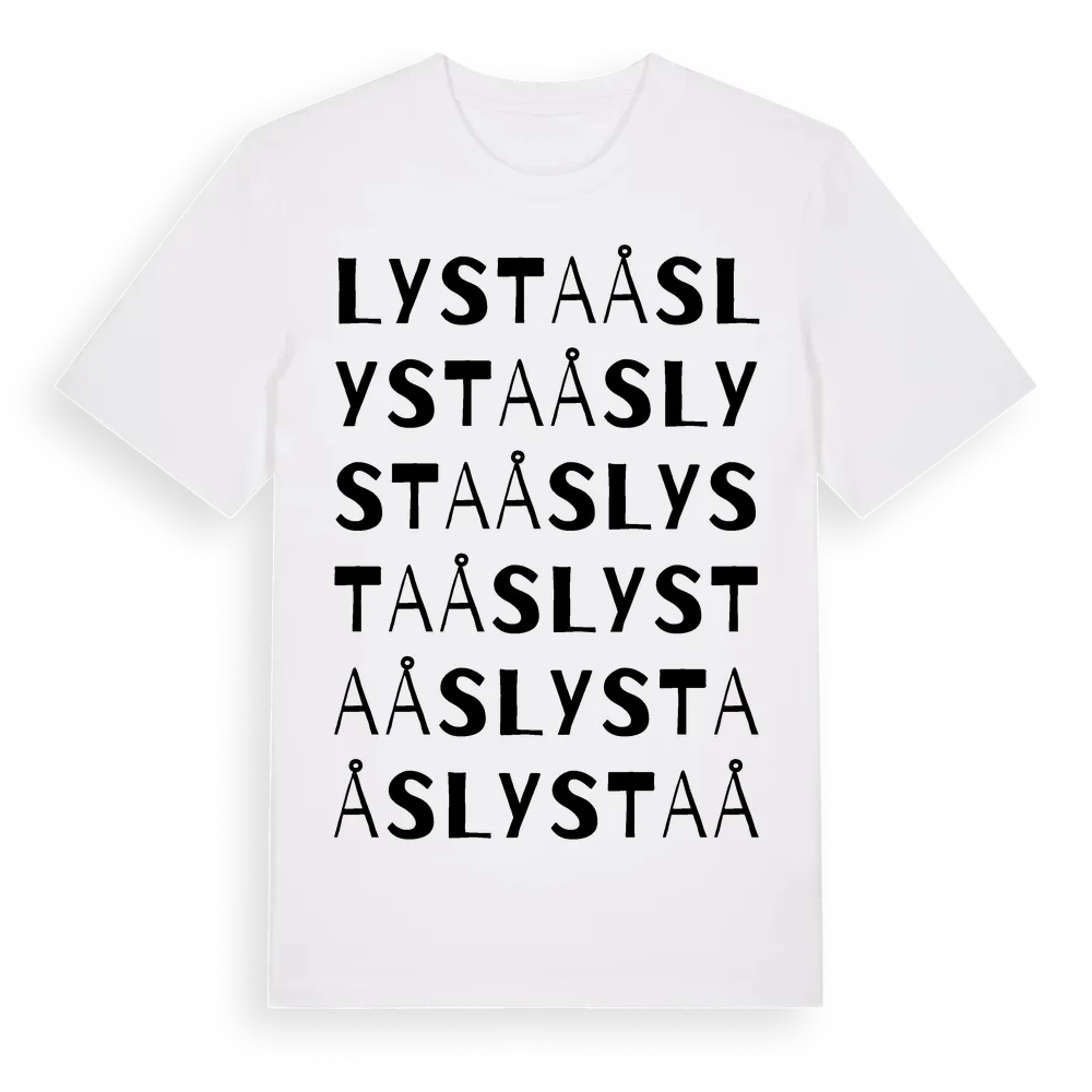 Lystaås ordlek t-shirt är inspirerad av Lystaås i Uppsala län, Sverige. Tröjan är designad för dig som har en speciell koppling till platsen – oavsett om du bor här, har rötterna här eller bara älskar Lystaås.