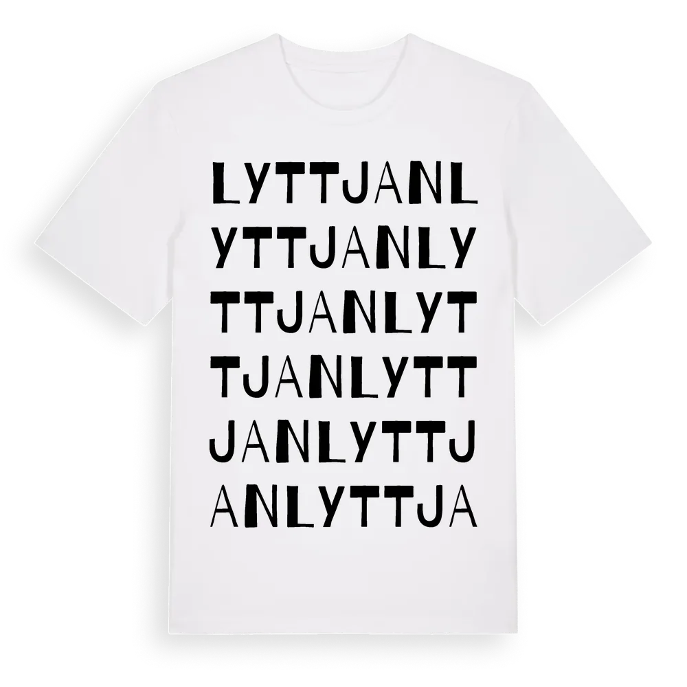 En ordlek byggd på Lyttjans namn. Subtilt och klurig – ett motiv som bara de som verkligen känner platsen fullt ut förstår. Premium bomull, unisex – från Lyttjan i Uppsala län.