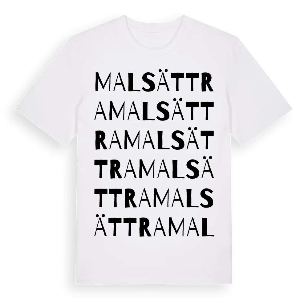 Malsättra ordlek t-shirt är inspirerad av byn Malsättra i Uppsala län, Sverige. Tröjan är designad för dig som har en speciell koppling till platsen – oavsett om du bor här, har rötterna här eller bara älskar Malsättra.