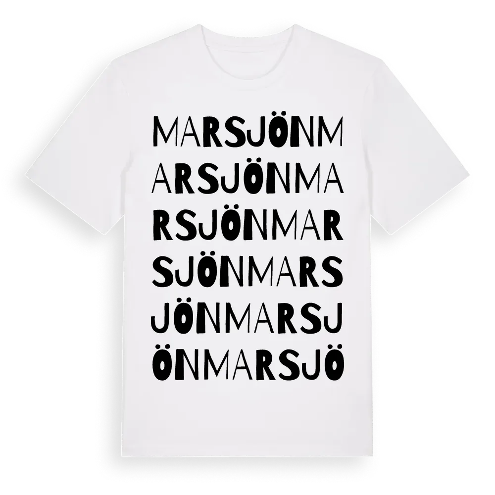 Marsjön ordlek t-shirt är inspirerad av byn Marsjön i Uppsala län, Sverige. Tröjan är designad för dig som har en speciell koppling till platsen – oavsett om du bor här, har rötterna här eller bara älskar Marsjön.