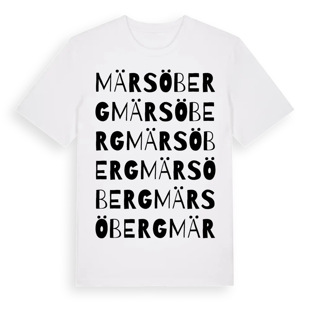 Märsöberg ordlek t-shirt är inspirerad av Märsöberg i Uppsala län, Sverige. Tröjan är designad för dig som har en speciell koppling till platsen – oavsett om du bor här, har rötterna här eller bara älskar Märsöberg.