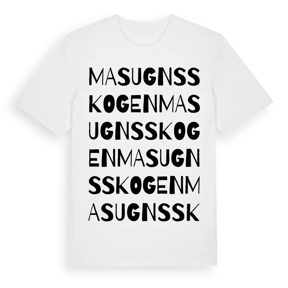 Masugnsskogen ordlek t-shirt är inspirerad av byn Masugnsskogen i Uppsala län, Sverige. Tröjan är designad för dig som har en speciell koppling till platsen – oavsett om du bor här, har rötterna här eller bara älskar Masugnsskogen.