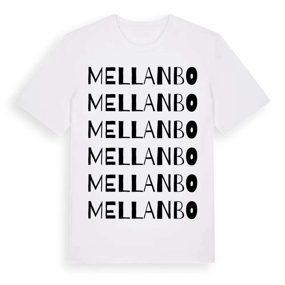 Mellanbo ordlek t-shirt är inspirerad av Mellanbo i Uppsala län, Sverige. Tröjan är designad för dig som har en speciell koppling till platsen – oavsett om du bor här, har rötterna här eller bara älskar Mellanbo.