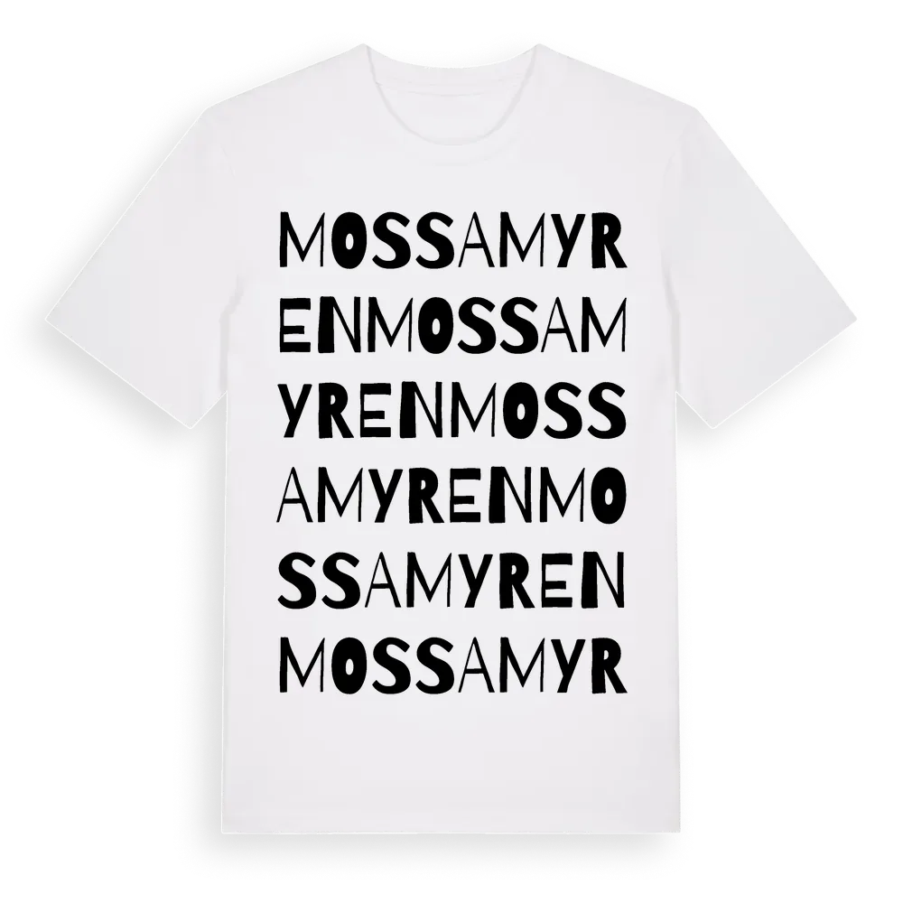 En ordlek byggd på Mossamyrens namn. Subtilt och klurig – ett motiv som bara de som verkligen känner platsen fullt ut förstår. Premium bomull, unisex – från Mossamyren i Uppsala län.