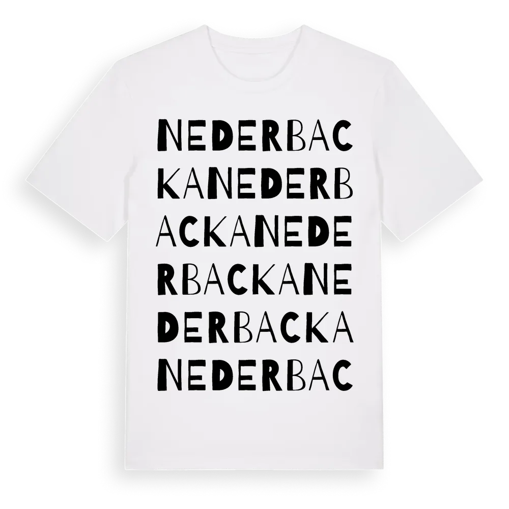 Nederbacka ordlek t-shirt är inspirerad av Nederbacka i Uppsala län, Sverige. Tröjan är designad för dig som har en speciell koppling till platsen – oavsett om du bor här, har rötterna här eller bara älskar Nederbacka.