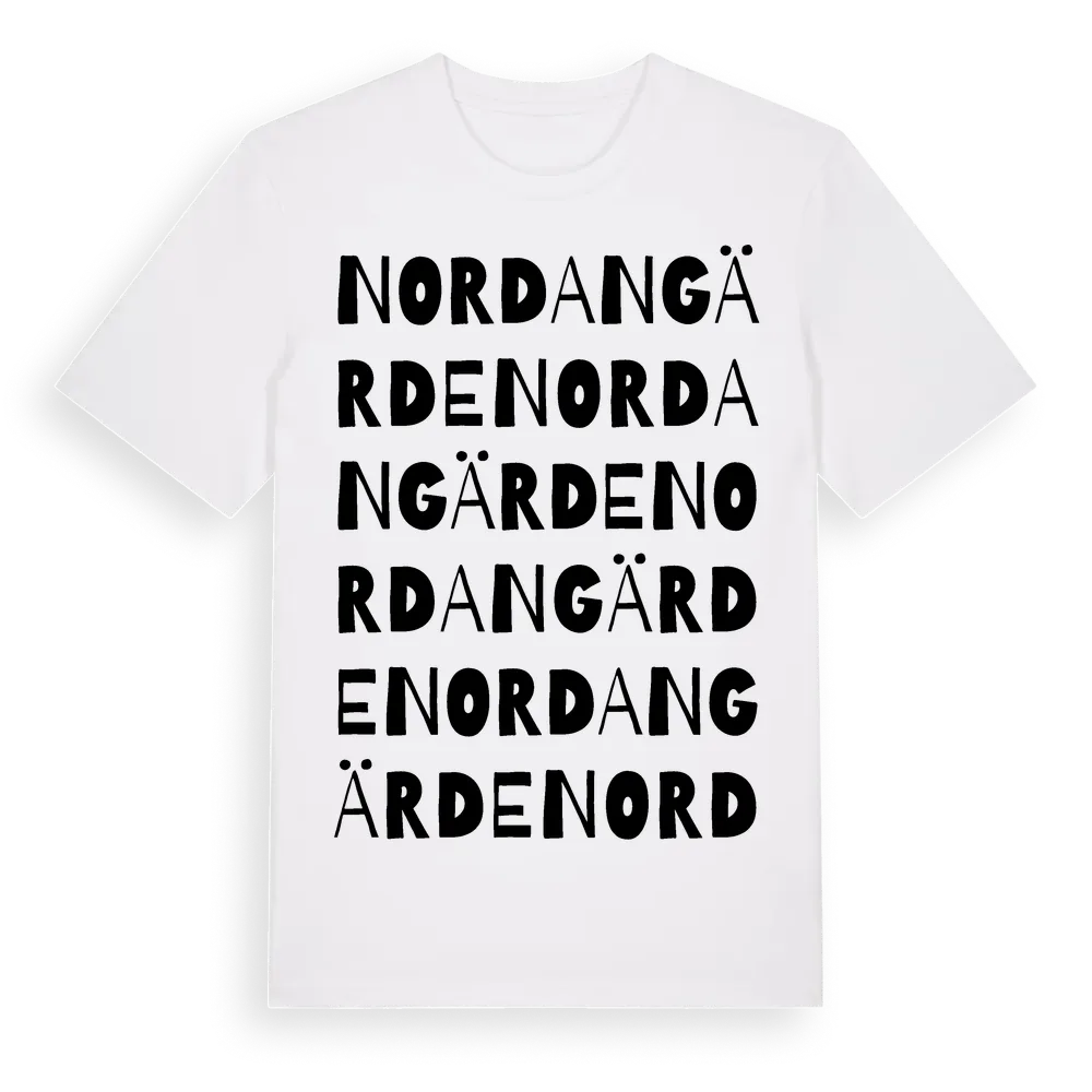 Nordangärde ordlek t-shirt är inspirerad av byn Nordangärde i Uppsala län, Sverige. Tröjan är designad för dig som har en speciell koppling till platsen – oavsett om du bor här, har rötterna här eller bara älskar Nordangärde.