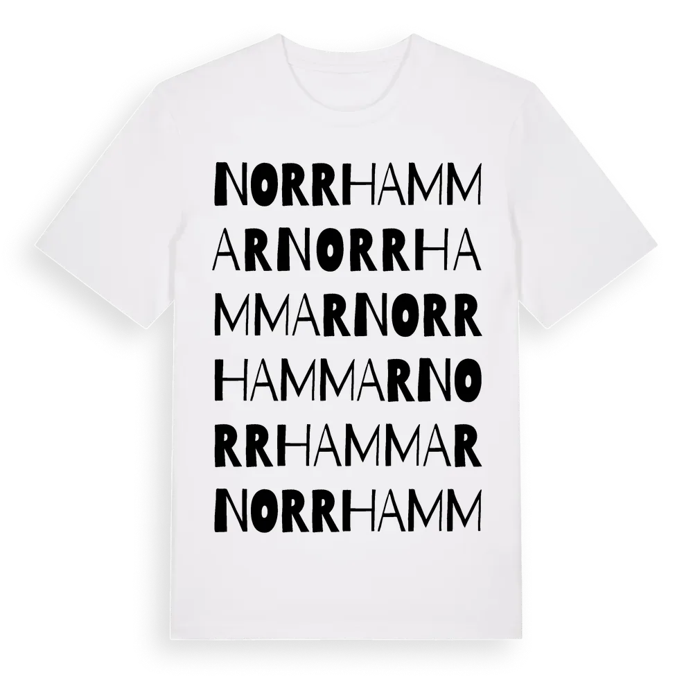 Norrhammar ordlek t-shirt är inspirerad av byn Norrhammar i Uppsala län, Sverige. Tröjan är designad för dig som har en speciell koppling till platsen – oavsett om du bor här, har rötterna här eller bara älskar Norrhammar.